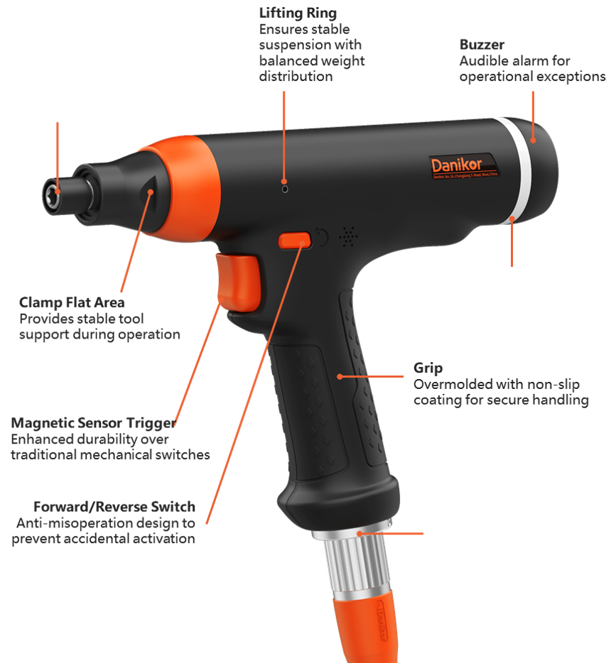 Built with anti-static materials for safe handheld tightening, even in 220V high-voltage environments. *Note: Metal components must be grounded