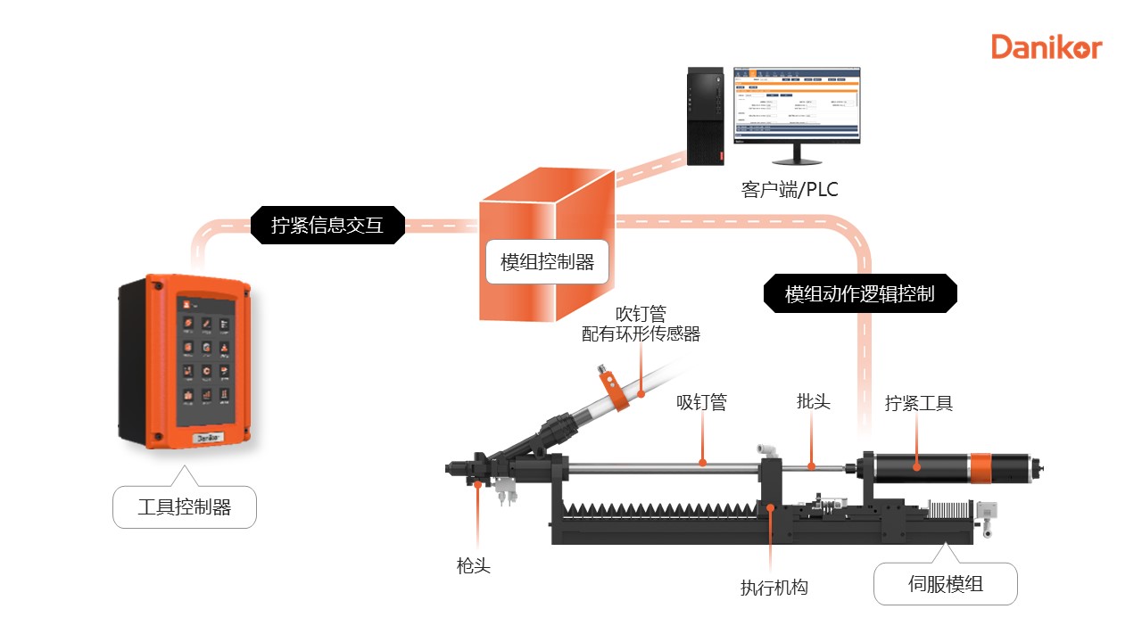 伺服拧紧模组采用电驱动方式,替代传统模组的气缸集成拧紧工具,实现螺钉自动拧紧过程。模组与工具之间客户可以通过plc进行交互信息实现位移、推力与拧紧转速扭矩之间的交互控制,从而实现更高效、精确、稳定的拧紧。